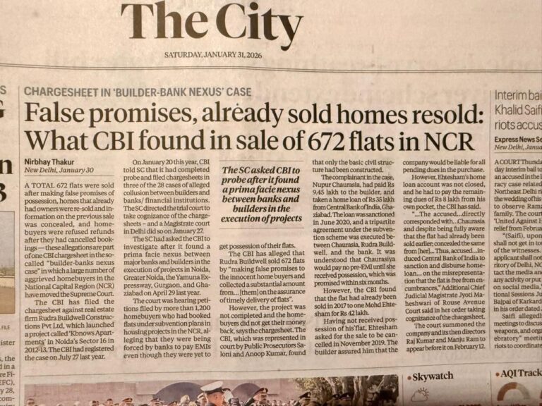 I appeared as counsel for Ms. Nupur Chaurasia, one of the affected buyers whose case forms part of the CBI’s findings. Despite making substantial payments under a “No EMI till possession” scheme, she was denied possession and refund—highlighting how such schemes systematically transferred risk from builders (in this case Ridra Buildwell Constructions Pvt. Ltd.